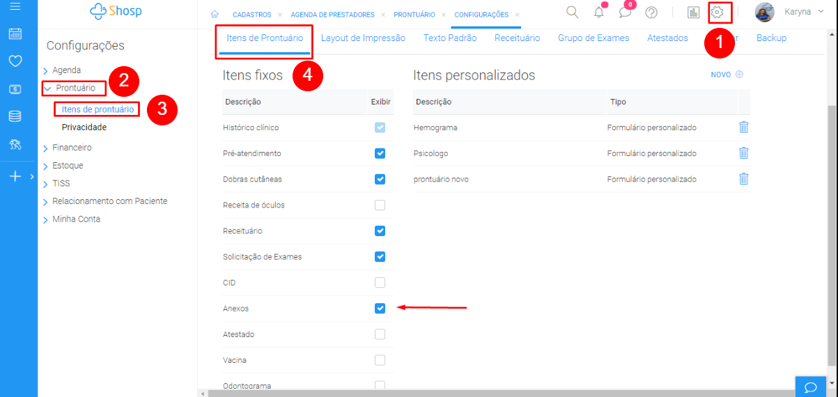 - Configurações > prontuário > itens de prontuário > escolha o prestador
