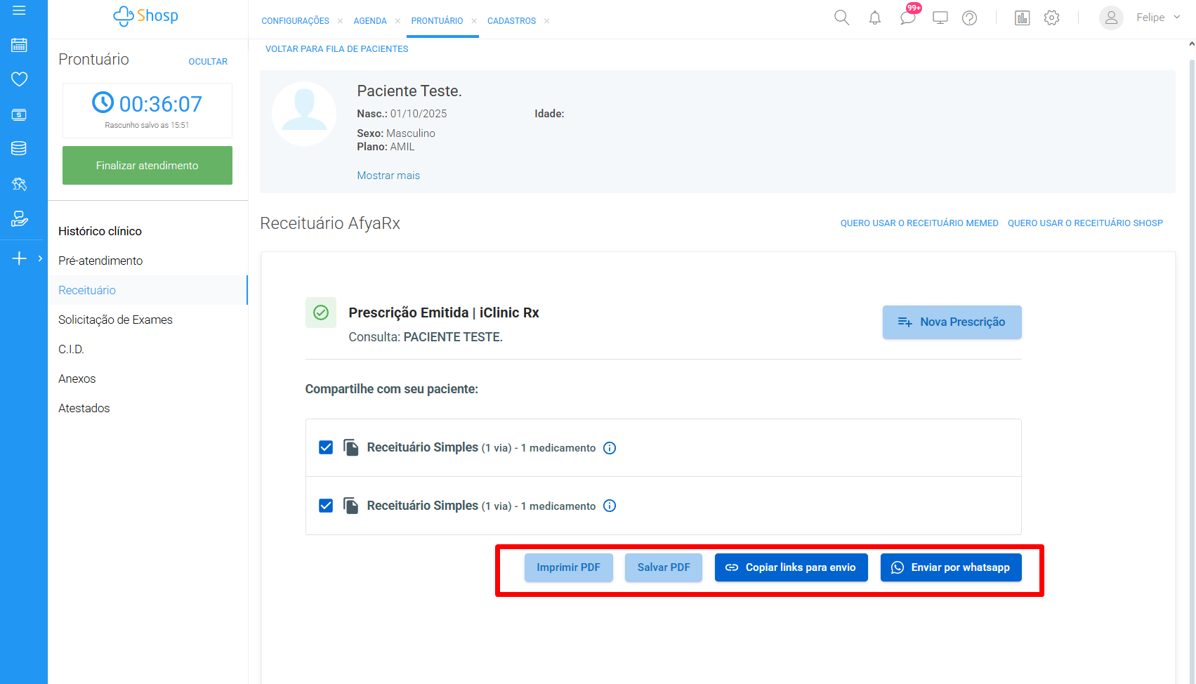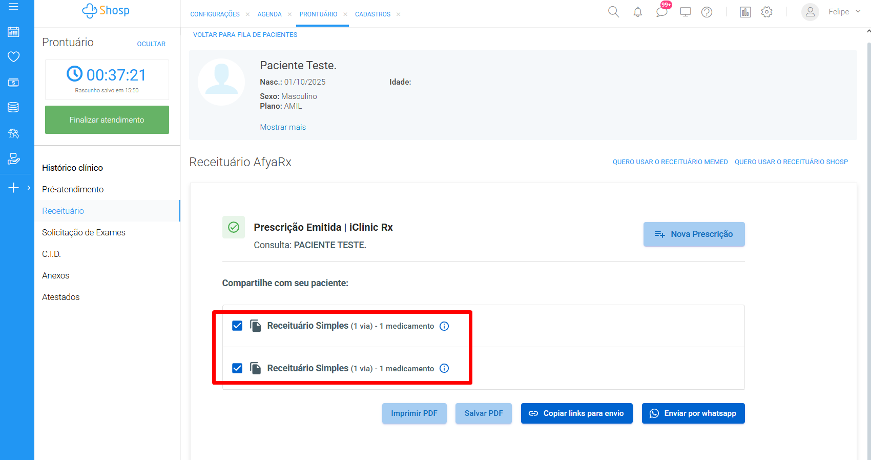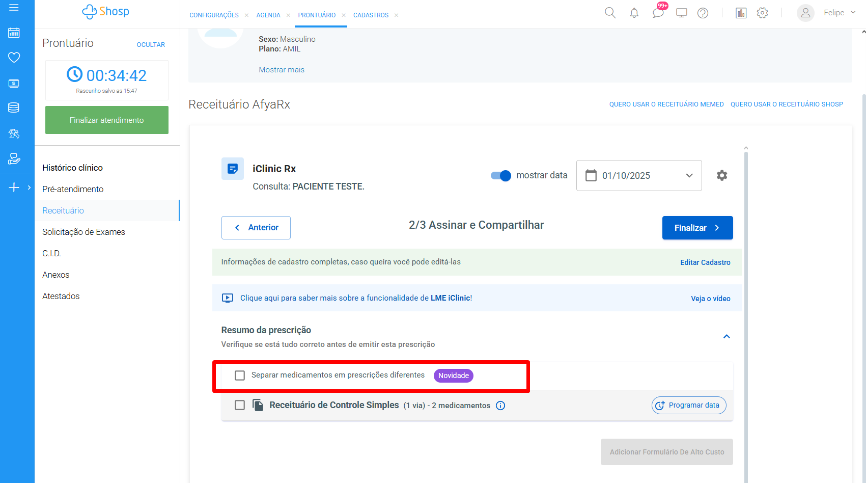 baixo, estarão listadas todas as prescrições realizadas. Você deve selecionar a caixa de seleção na lateral direita, marcando quais gostaria de separar. Se for o caso, é possível selecionar todas.