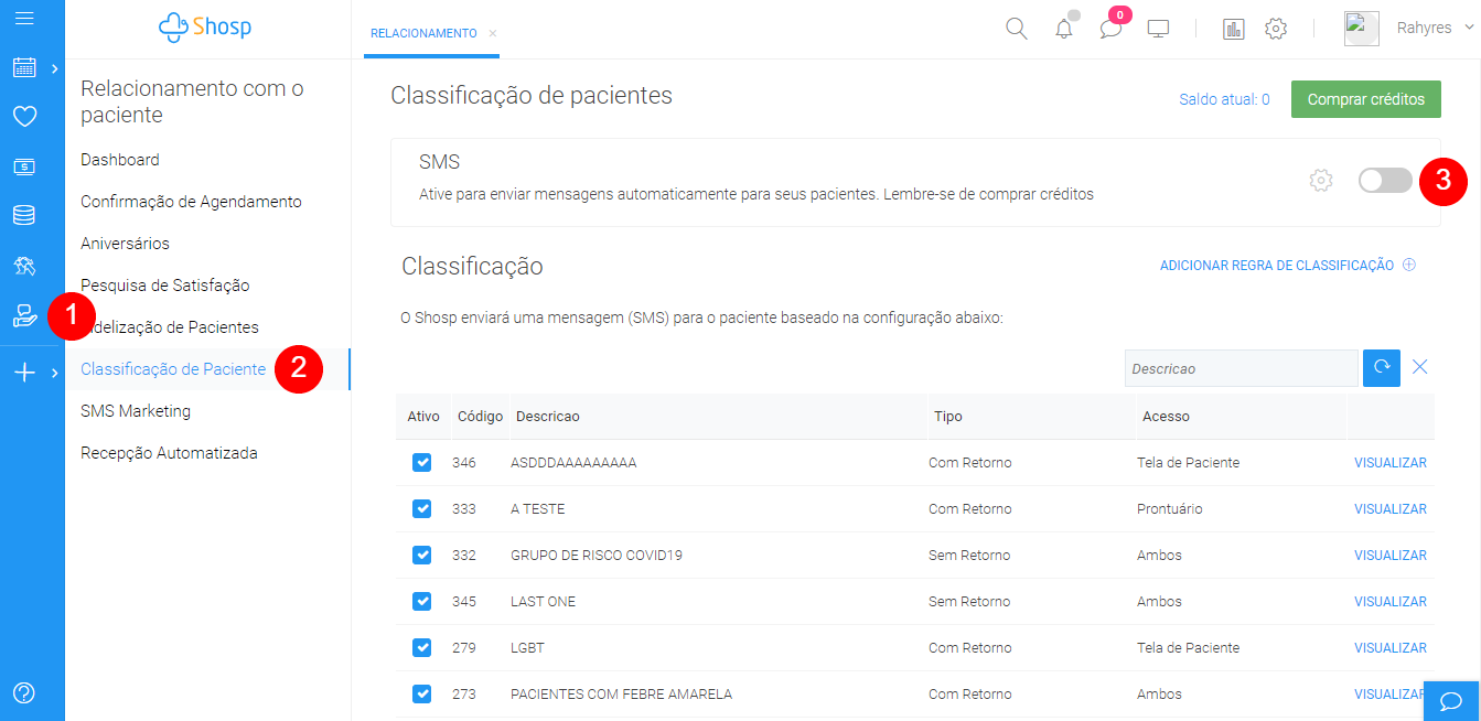A classificação de paciente serve para que se possa criar "grupos" e, assim, facilitar a análise e a comunicação com vários pacientes que possuam características semelhantes, ao mesmo tempo. Ela também serve para que o Shosp envie SMS automáticos convidando o paciente a retornar à clínica.