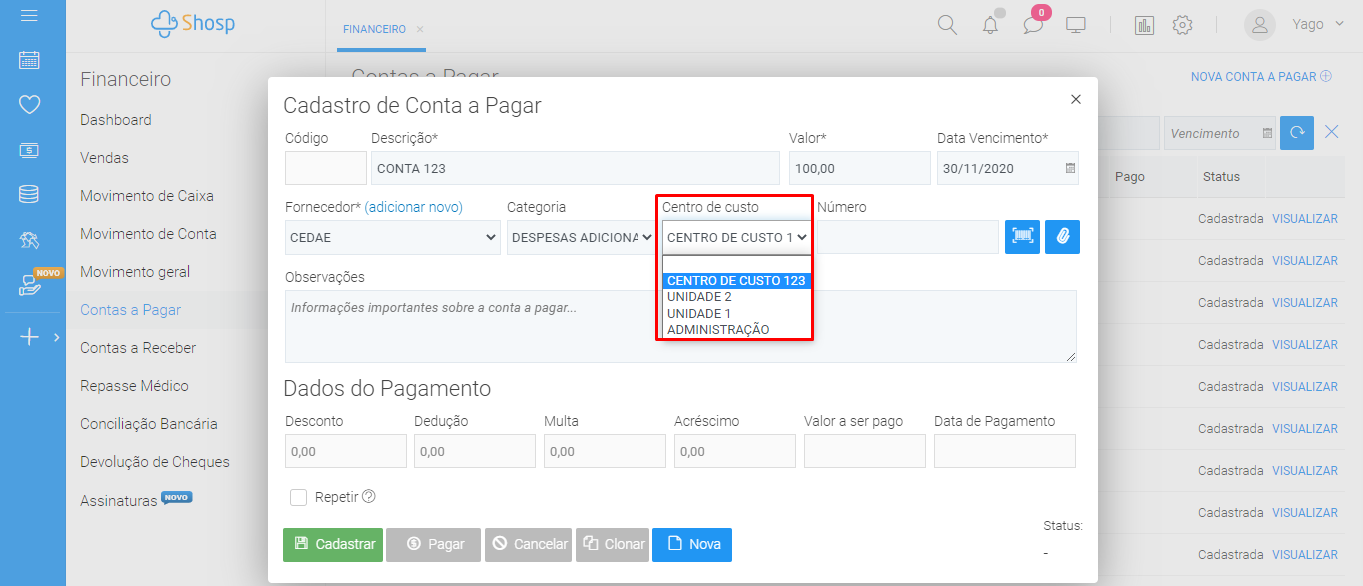 Tanto em sua tela de movimento de conta quanto movimento de caixa, ao registrar uma receita ou despesa, você terá o campo disponível para selecionar o centro de custo específico: