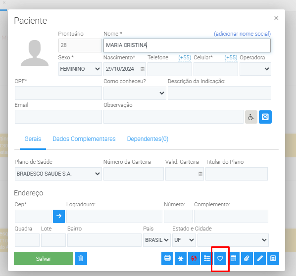 - Na tela de cadastro aberta, clicar no ícone de histórico clínico