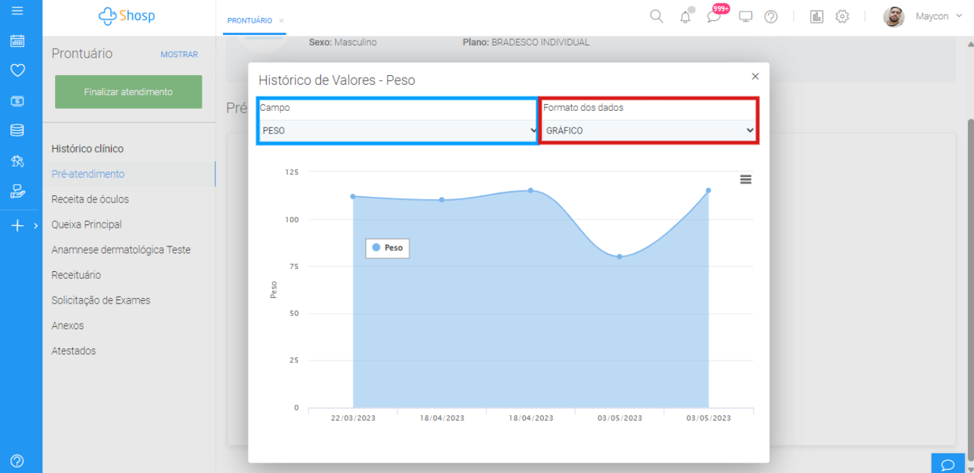 Você pode filtrar o gráfico de de acordo com o campo que você precisa, podendo ser peso, altura IMC entre outro.