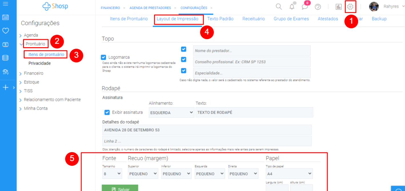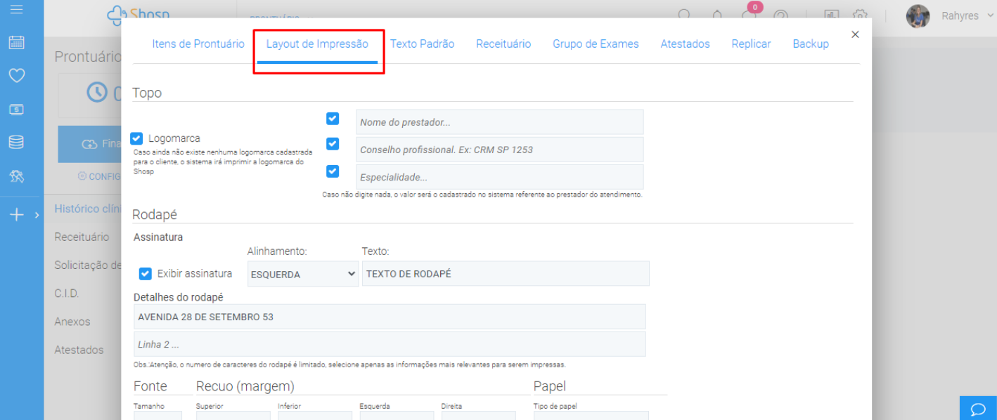 Configure o layout de impressão do prontuário conforme sua necessidade.