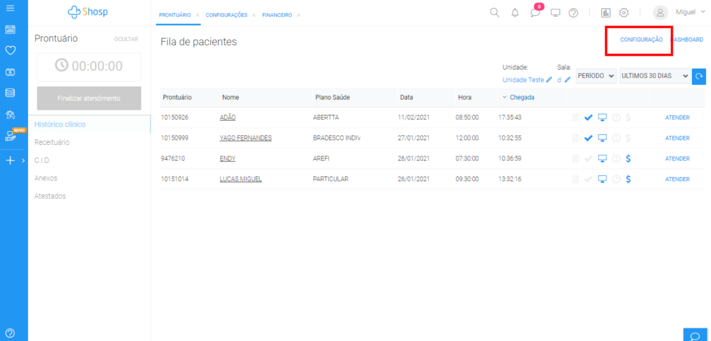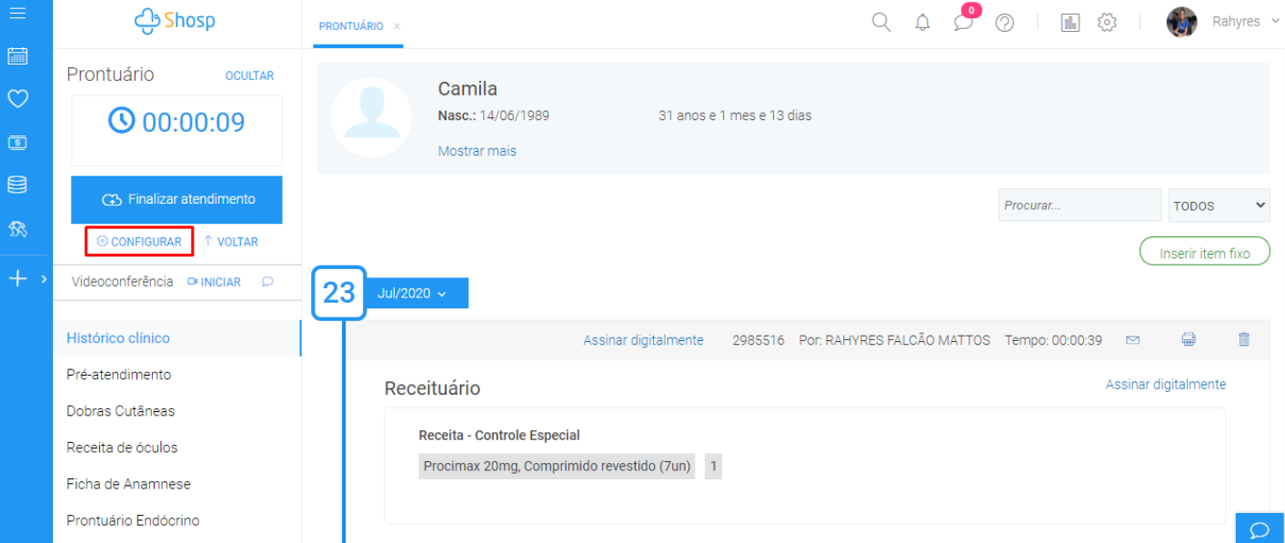 Também na tela de atendimento do paciente, temos o botão Configurar que direciona para a tela de configurações de prontuário.