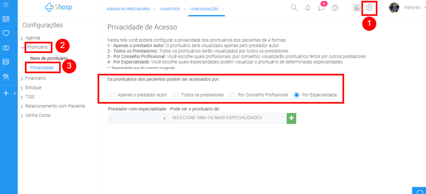 4 - De acordo com Especialidade: Você escolhe quais profissionais, por especialidade, visualizarão prontuários feitos por outros prestadores, de acordo com as especialidades selecionadas
