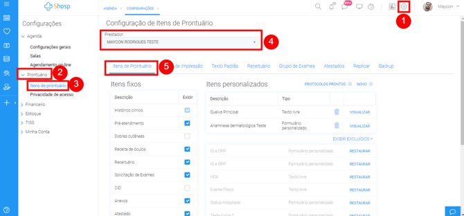 1 - Itens Fixos: São itens de prontuários que já vêm prontos e o prestador pode escolher quais usar. Por exemplo: receita de óculos, pré-atendimento, solicitação de exames, atestado, etc.