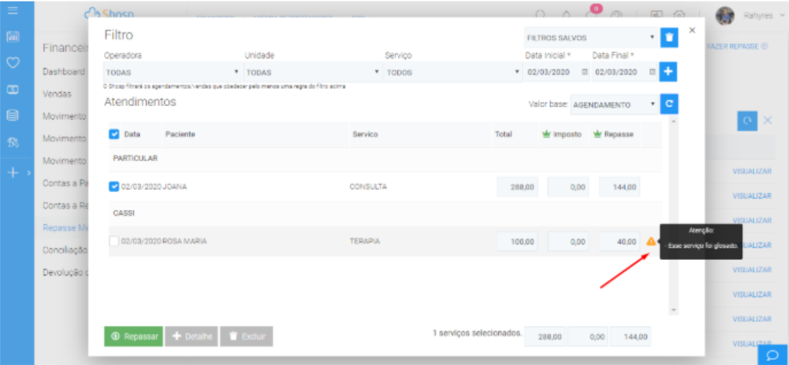 Ao realizar um repasse de uma guia que teve glosa informada no lote, esse repasse vai vir desmarcado, com um alerta informando que esse serviço foi glosado e com o valor que foi informado de glosa sendo descontado, assim você terá a opção de repassar apenas o valor que recebeu ou aguardar para repassar penas quando receber o valor total do plano de saúde.