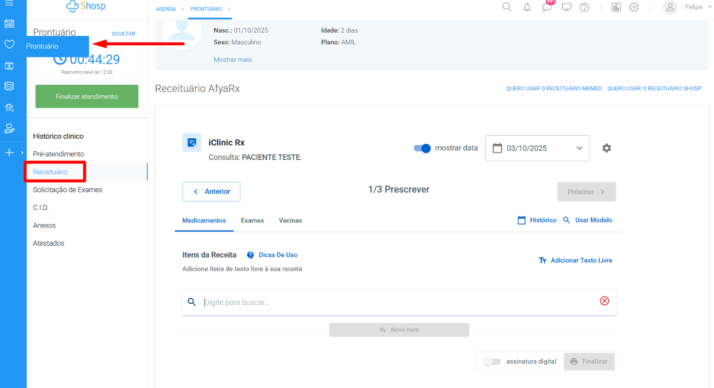 Para utilizar LME em Afya Rx, você deve acessar primeiramente o ícone do prontuário (coração) ou direto pelo agendamento do paciente, iniciar um atendimento e acessar a seção Prescrições.
