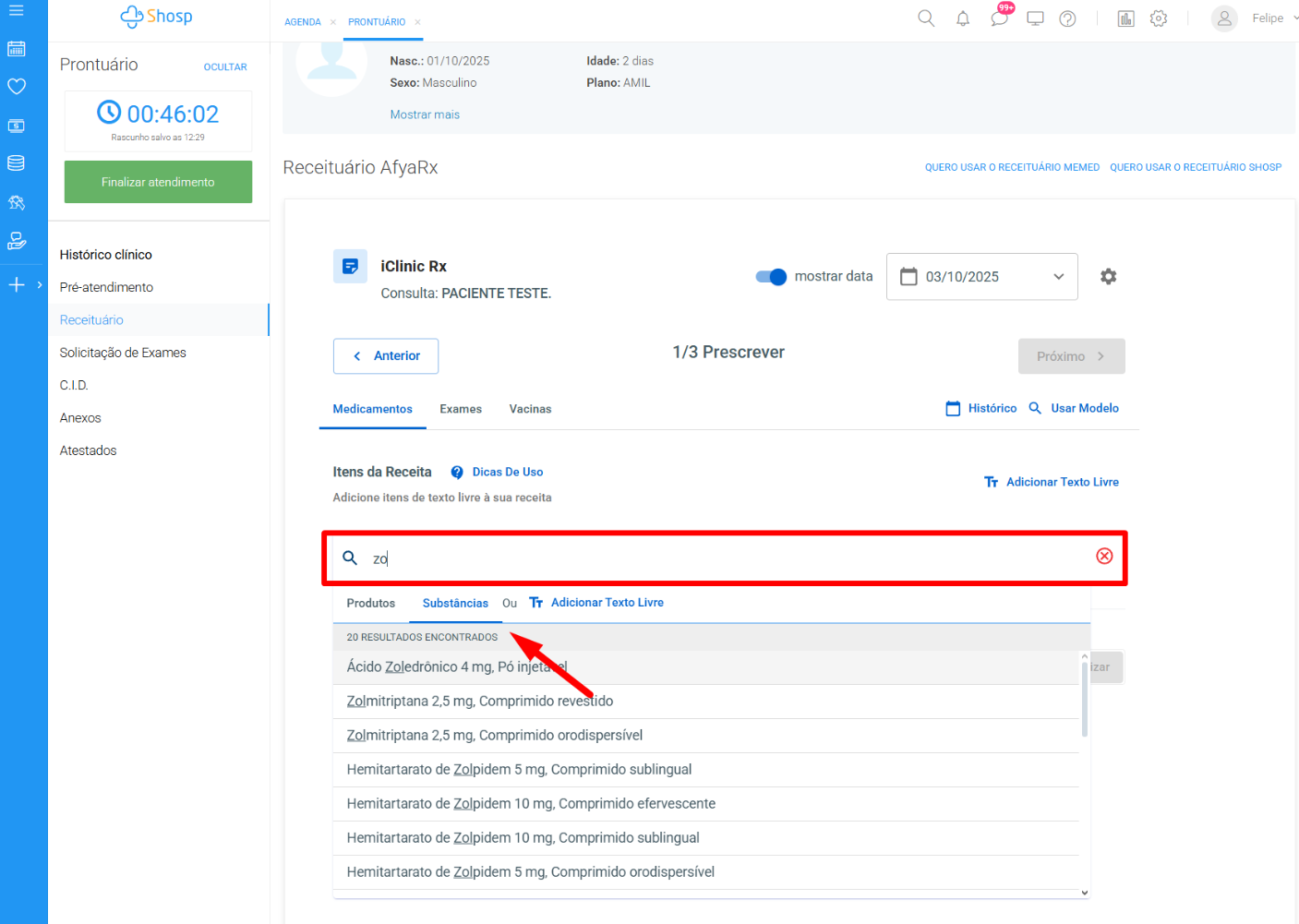 No campo Medicamentos, você deve digitar o nome do medicamento, selecionar a opção Substâncias, escolher o item desejado e prosseguir com o preenchimento da posologia.