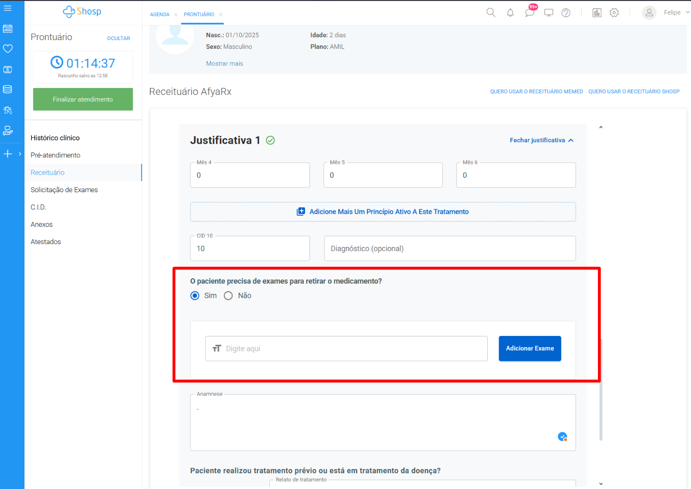 Também é necessário informar se o paciente precisa de exames para retirar o medicamento, caso precise selecione Sim e abrirá um campo para solicitar estes exames.