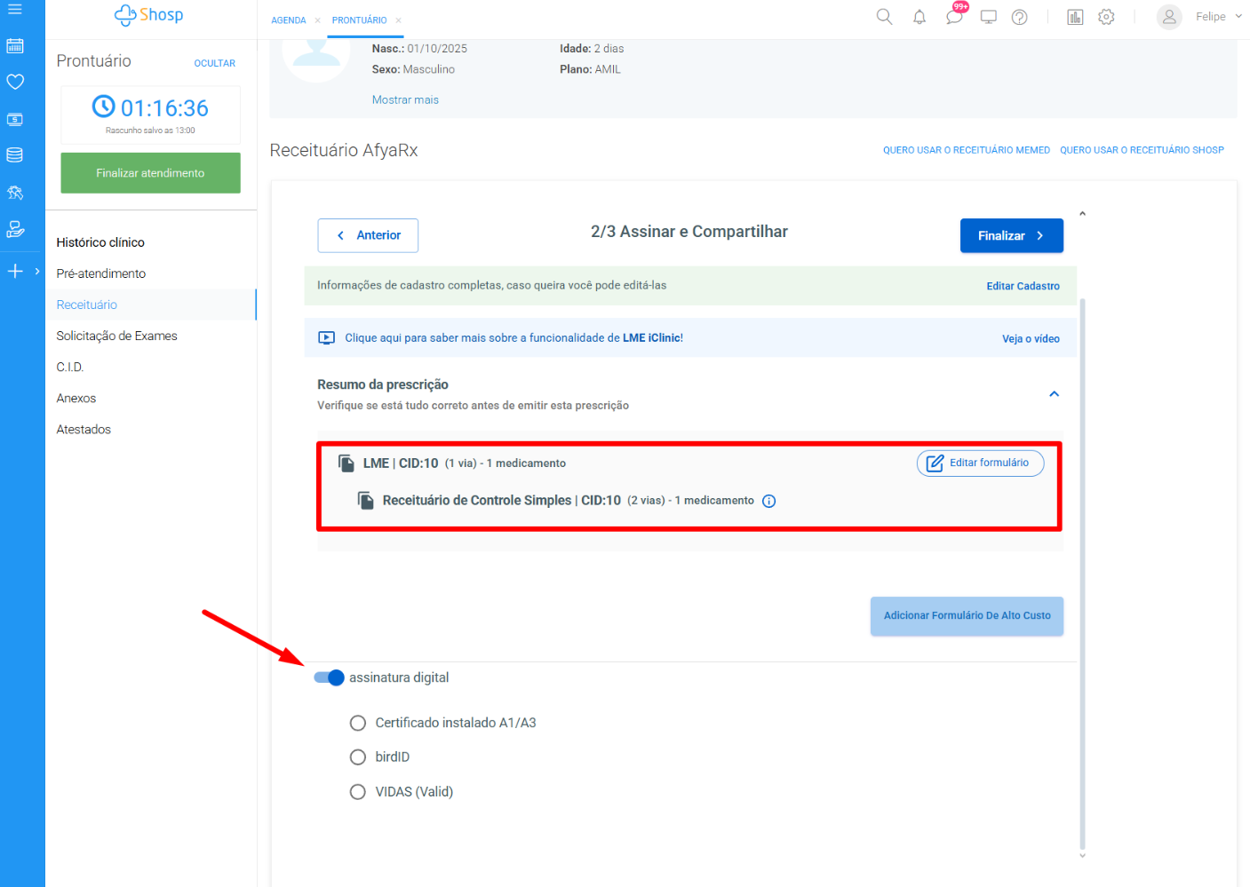 No próximo passo, você poderá assinar digitalmente apenas a prescrição, visto que as exigências do Ministério da Saúde não permitem que o formulário seja assinado e enviado digitalmente. O Laudo LME deverá ser impresso e assinado manualmente.