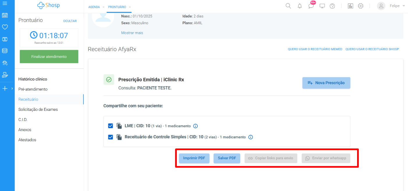 Vá em “Finalizar” e na próxima tela terá a opção de Salvar e imprimir o PDF e enviar a prescrição via WhatsApp