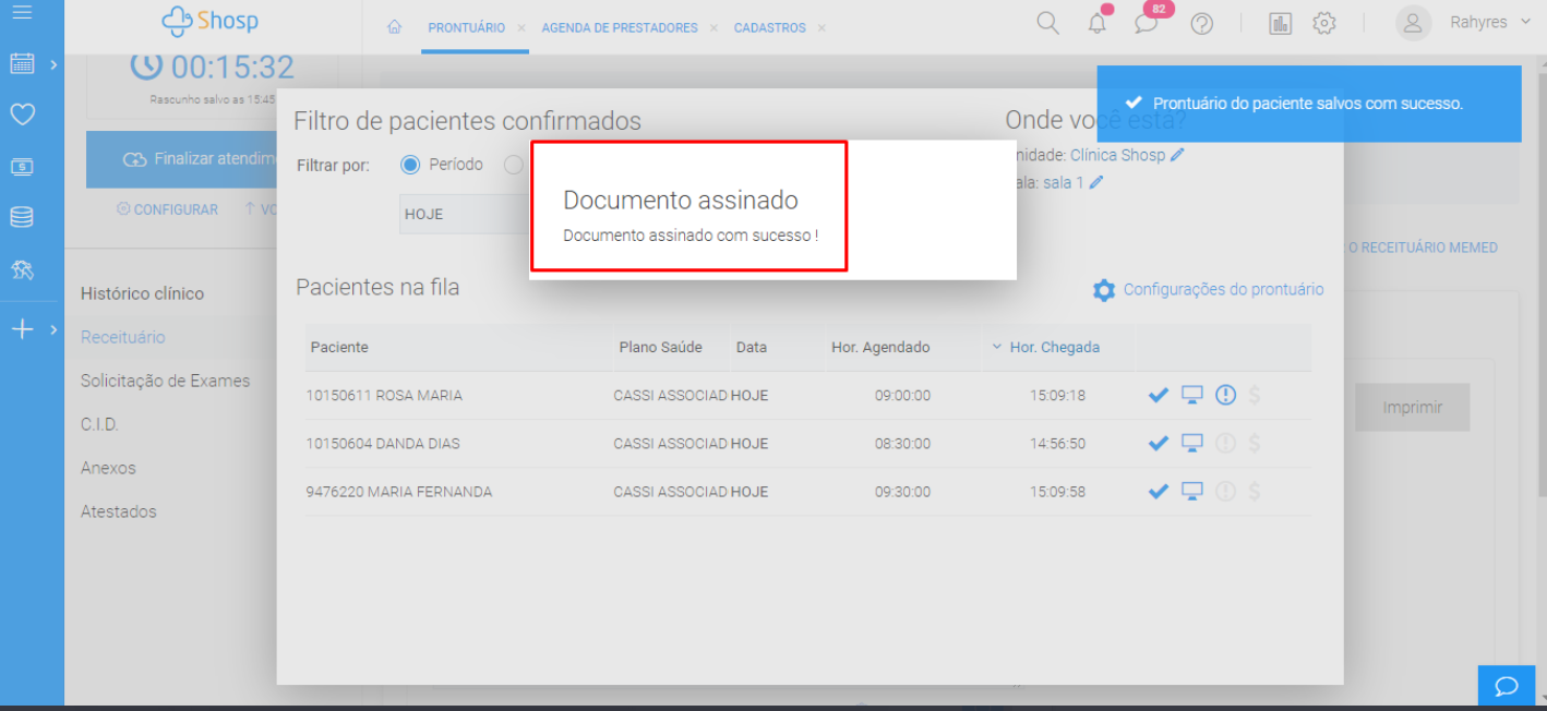 Clicando nessa opção, o prontuário será enviado para o processo de assinatura, o que pode levar até 1 minuto. Depois o documento ficará com a informação "Ver documento Assinado" também.