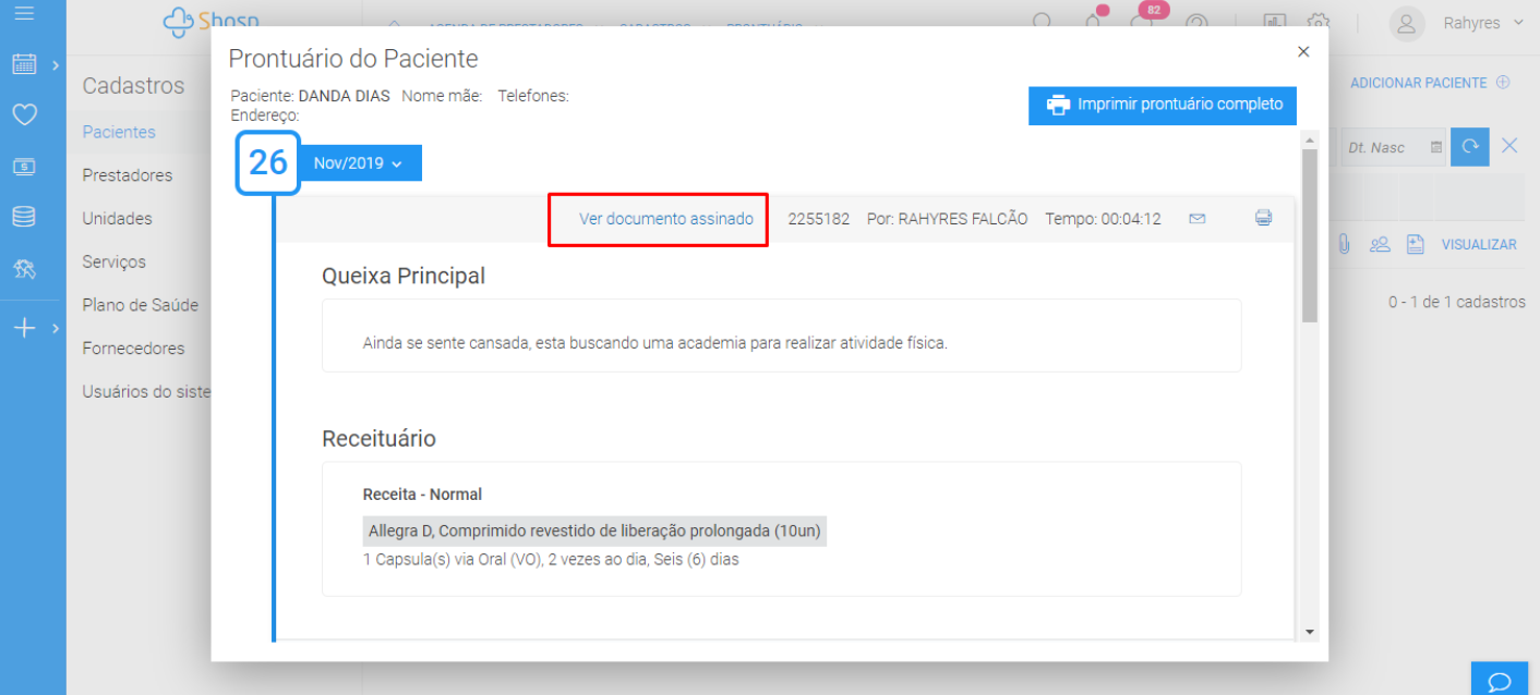 Você também pode realizar a assinatura de um prontuário anterior, acessando o cadastro de paciente. Veja: