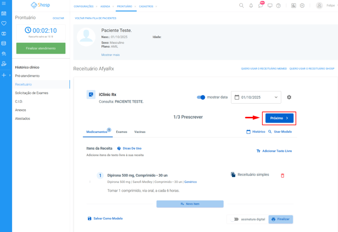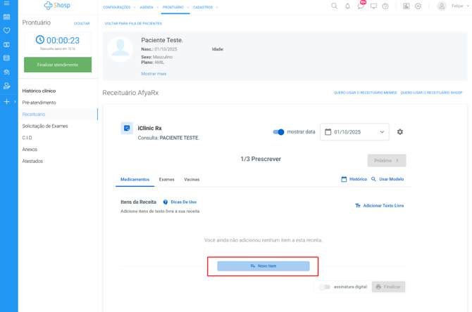 Para assinar digitalmente a prescrição, utilizando a Afya RX, você deve iniciar um atendimento na aba prontuário ou direto do agendamento de um paciente, em seguida, acessar a seção “Prescrições”: