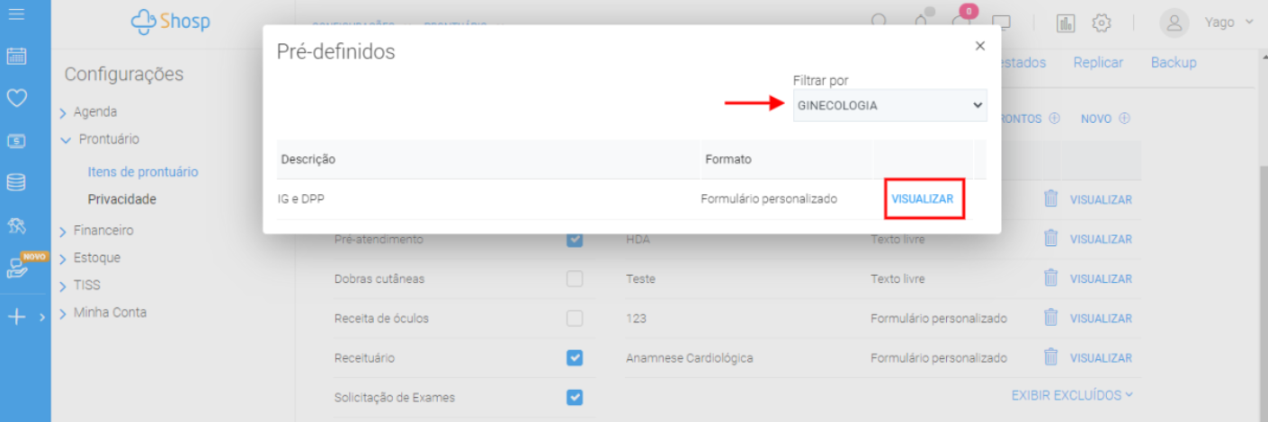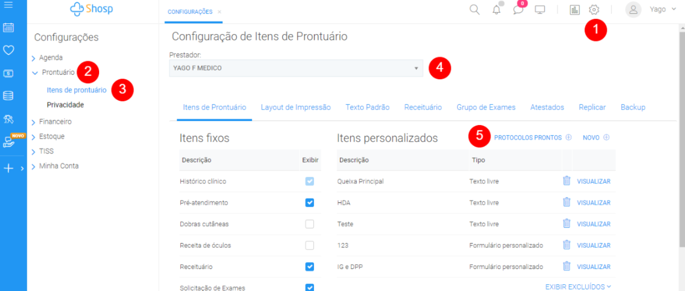 Vá em Configurações >> Prontuário >> Itens de Prontuário >> Selecione o prestador desejado (Caso tenha mais de um na sua conta) >> Clique em Protocolos Prontos