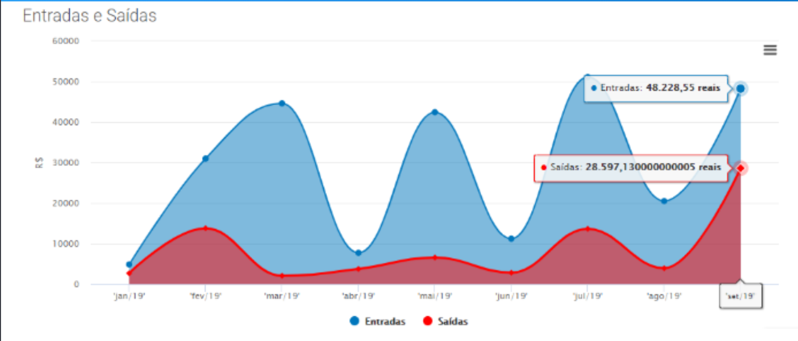 Outra maneira de verificar esses valores é somando o resultados dos saldos dos relatórios de movimento de caixa e movimento de conta para o mesmo período. Por exemplo, o gráfico de entradas e saídas de setembro deve ser comparado com o resultado dos relatório de movimento de caixa e conta gerados para o mês de setembro.
