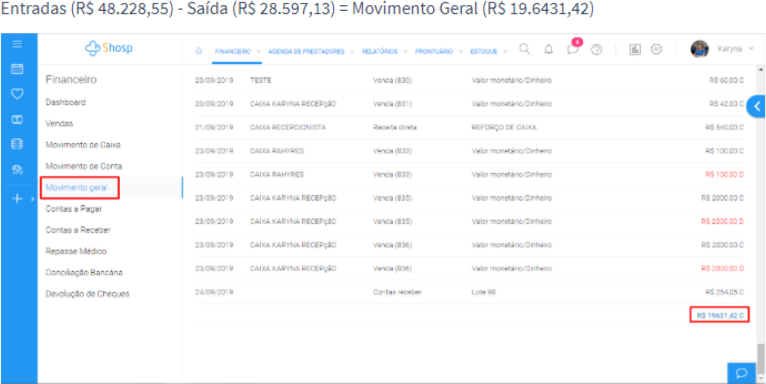 Ele representa o movimento geral do seu financeiro, ou seja, são todos os seus lançamentos feitos no sistema. Ele indica o fluxo financeiro do seu mês, o resultado de todas as receitas e despesas realizadas. O movimento geral fica localizado em: