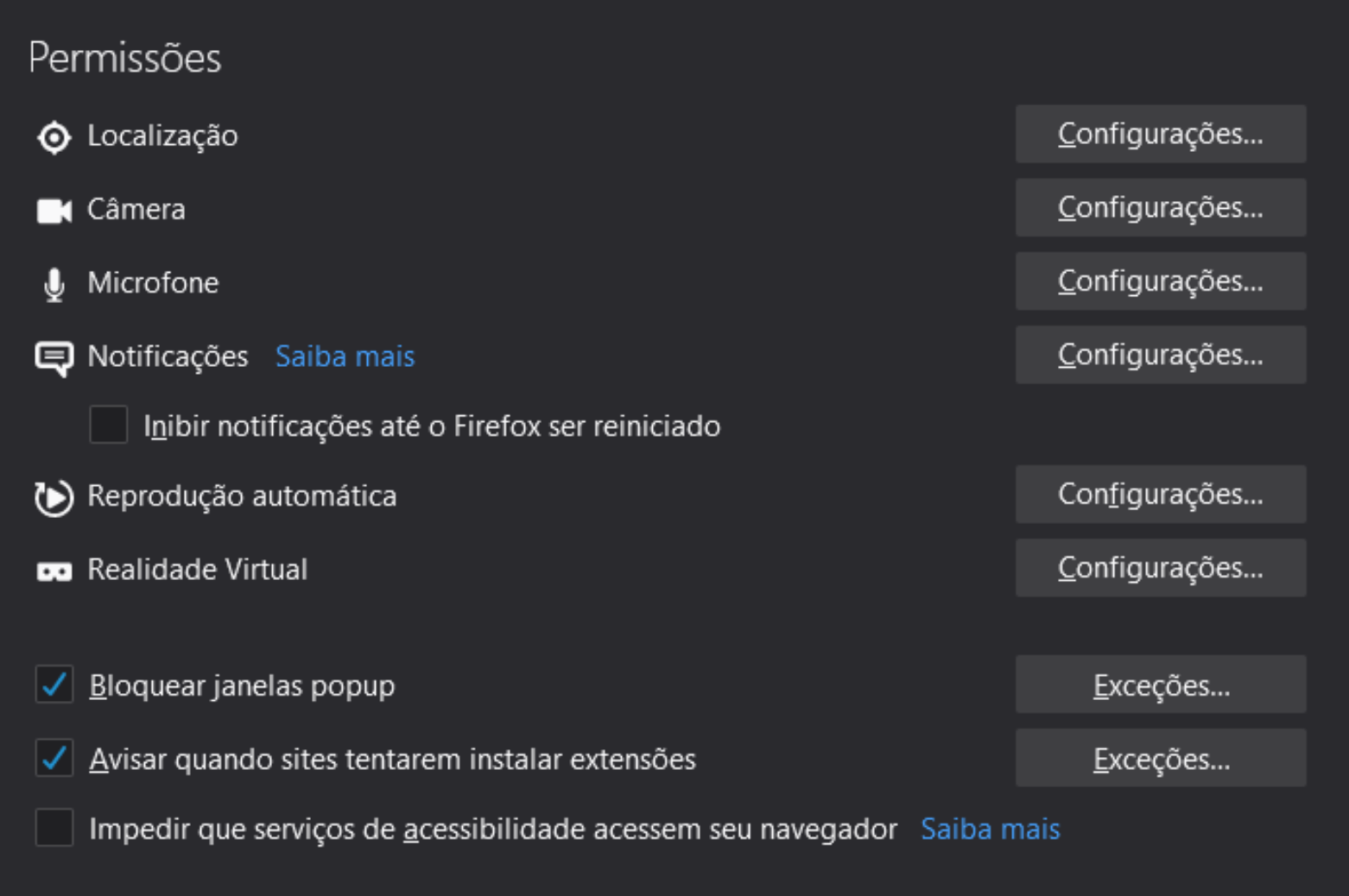 Assim como no Chrome, para acessar as configurações de uma maneira mais fácil utilize o link: about:preferences#privacy