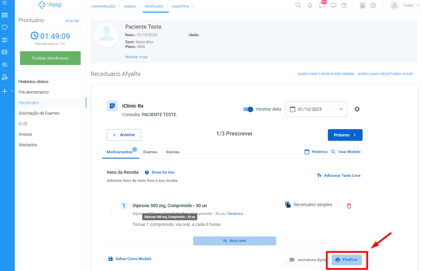 Com a prescrição pronta, clique no botão Finalizar: