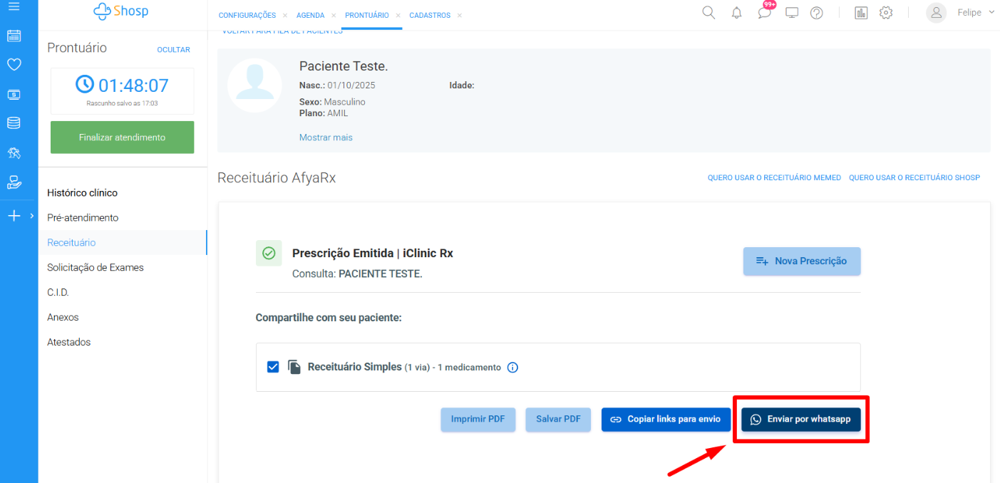 Pode imprimir, baixar o PDF, copiar o link da prescrição (para envio por e-mail ou outros canais) e, para fazer a sincronização com o WhatsApp, utilizando o número de celular de sua preferência, você deve clicar em Enviar por WhatsApp: