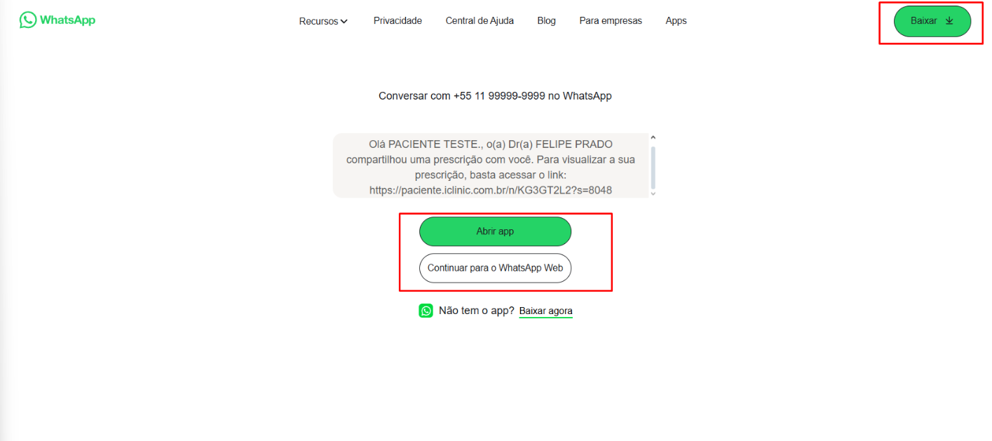 Se ainda não tiver, pode optar por instalá-lo clicando em Baixar, ou usar a opção WhatsApp Web, fazendo o envio através do seu navegador: