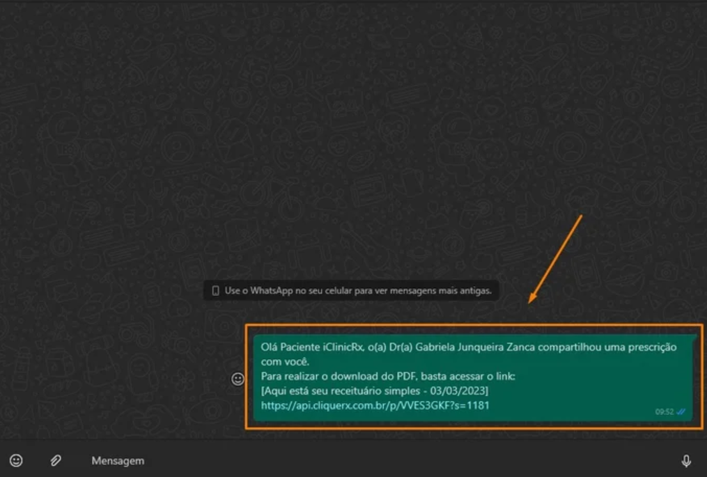 Com a sincronização finalizada, você será direcionado(a) automaticamente para a conversa com o paciente, com o texto de envio pronto, que contém: